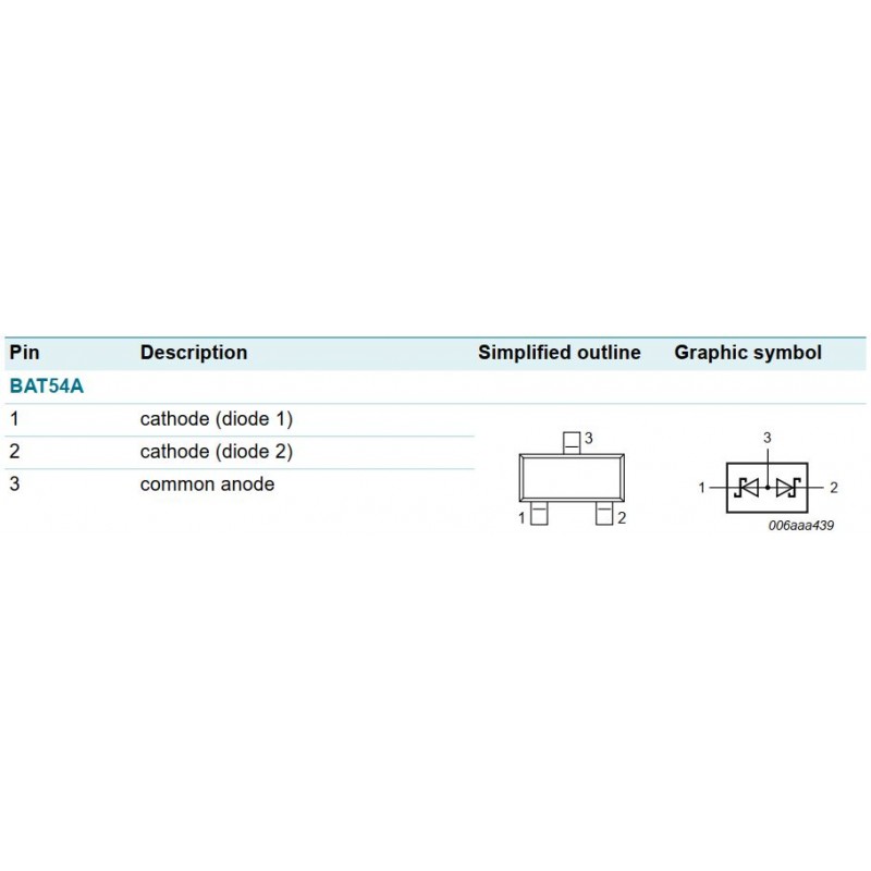 قطعه BAT54A دارای 2 عدد دیود شاتکی آند مشترک با تحمل ولتاژ 30 ولت و جریان دهی 200mA از نوع smd و پکیج sot-23 می باشد. SMD CODE: V3 جزییات بیشتر