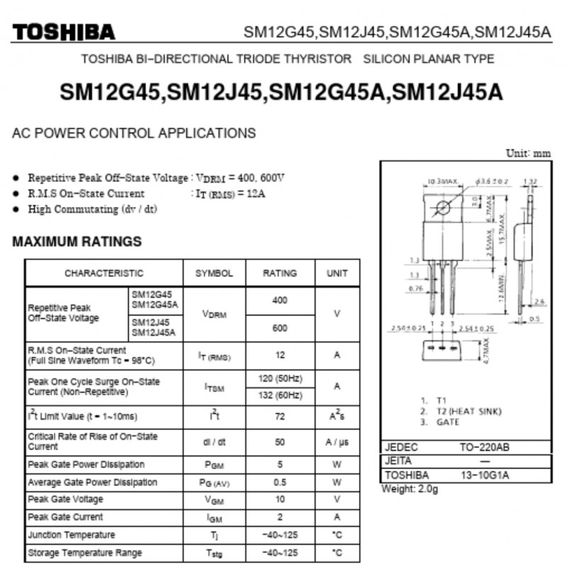 Toshiba Semiconductor Repetitive Peak Off−State Voltage : VDRM = 400, 600V ○ R.M.S On−State Current : IT (RMS) = 12A